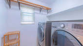 Pralnia z pralką i suszarką do ubrań w pobliżu ściany.