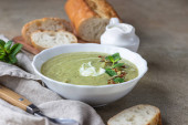 Obiad z kalafiora ziemniaczanego zdobią gotowane jajko, oliwa z oliwek i rukola podawane z chlebem rzemieślniczym. Wegetariańska koncepcja zdrowej żywności. Jasnoszare tło. Widok z góry.