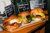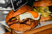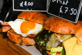 Wędzony łosoś brioche przystawkaŻywa stacja gotowania. Świeże jedzenie w formie bufetu Brunch Catering Posiłki Jedzenie Party Sharing Concept