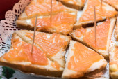 Wędzony łosoś brioche przystawkaŻywa stacja gotowania. Świeże jedzenie w formie bufetu Brunch Catering Posiłki Jedzenie Party Sharing Concept