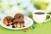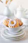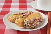 Domowej roboty mini bundt ciasto pokryte sosem czekoladowym i kolorowe posypki