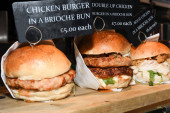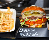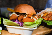 Świeże topienie burger gotowy do jedzenia podczas festiwalu fast food. Outdoor catering imprezy, brunch lub poza kolacją z fast food. Topiący się ser i złota bułka. Apetyczny hamburger domowej roboty