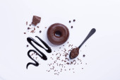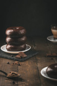 Praliny na drewnianej podstawie, głębokie cienie, zbliżenie. słodka i czekoladowa koncepcja.