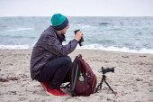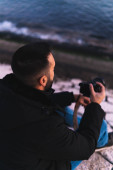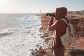 Młody azjatycki fotograf robiący zdjęcie ze szczytu góry, Północne Goa, Indie