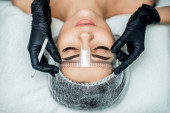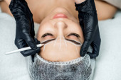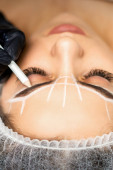 Markup z ołówkiem na brwiach młodej kobiety podczas makijażu na stałe, widok z góry.