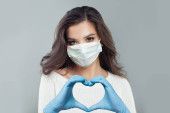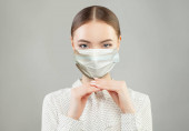 Kobieta w masce twarzy pokazuje pusty baner planszowy z pustym tle przestrzeni kopiowania dla wykresu infograficznego