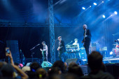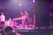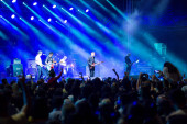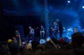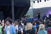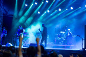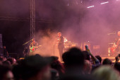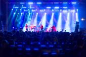Tbilisi Open Air 2019. Publiczność z podniesionymi rękami na festiwalu muzycznym i światłami spływającymi z góry sceny. Delikatna ostrość, wysoka ISO, ziarnisty obraz.