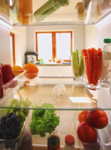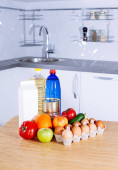 Zestaw świeżych warzyw surowych pomidor, ogórek, jajko, pomarańcza, jabłko, butelka wody i oleju, mleko na drewnianym stole w nowoczesnej kuchni. Zdrowe odżywianie. Dostawa żywności ekologicznej i produktów ekologicznych