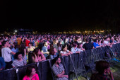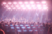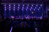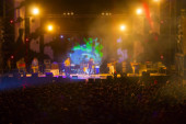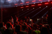 Tbilisi Open Air 2019. Publiczność z podniesionymi rękami na festiwalu muzycznym i światłami spływającymi z góry sceny. Delikatna ostrość, wysoka ISO, ziarnisty obraz.