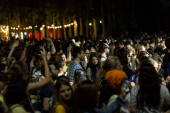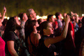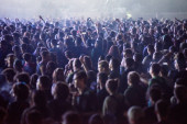 Tbilisi Open Air 2019. Publiczność z podniesionymi rękami na festiwalu muzycznym i światłami spływającymi z góry sceny. Delikatna ostrość, wysoka ISO, ziarnisty obraz.