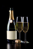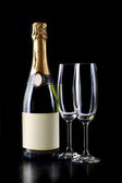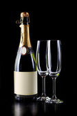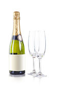 butelka szampana w chłodnicy i dwa kryształ na białym tle
