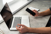Blisko dwie osoby, para za pomocą smartfona, laptopa, smartwatera, edukacji i koncepcji biznesu. Komunikacja podczas samoizolacji, widok z góry, przestrzeń kopiująca