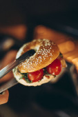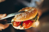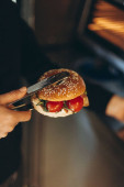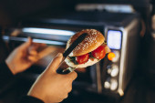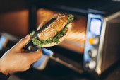 proces przygotowywania lub grillowania kanapki w kuchence mikrofalowej w kawiarni szybkiej obsługi