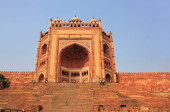 Fatehpur Sikri główne wejście do fortu zbudowanego z czerwonego piaskowca z białymi marmurowymi rzeźbami z długimi kamiennymi schodami w Agra India.