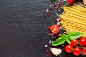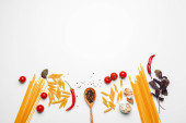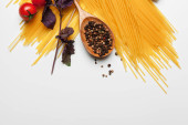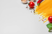 Makaron spaghetti ze składnikami do gotowania makaronu na białym tle, widok z góry.