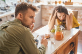 Zdjęcie "chory mężczyzna trzymający termometr podczas gdy kobieta trzymająca miskę ze śniadaniem w domu podczas samoizolacji, selektywne skupienie" może być wykorzystywane do celów osobistych i komercyjnych zgodnie z warunkami zakupionej licencji Royalty-free. Obraz jest dostępny do pobrania w jakości wysokiej rozdzielczości do 5760x3840.