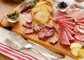 Tradycyjne produkty włoskie na drewnianej desce, zbliżenie, widok z góry