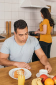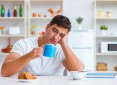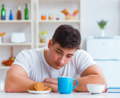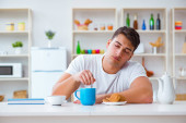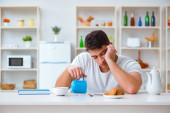 zaniepokojony chory człowiek z gorączką patrząc na termometr w kuchni podczas śniadania na temat samoizolacji