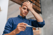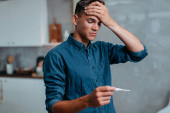 zaniepokojony chory człowiek patrząc na termometr w domu na samoizolacji