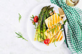 Kotlety wieprzowe z czosnku miodowego ze szparagami i słodkimi ziemniakami. Widok z góry, widok z góry