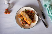 Kotlety wieprzowe z czosnku miodowego ze szparagami i słodkimi ziemniakami. Widok z góry, widok z góry
