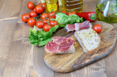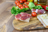 Kanapki z jamonem, zielone oliwki w szklanej misce. Kiełbaski fuetowe, kiełbaski chorizo, ser i paluszki chlebowe na drewnianym talerzu. Śródziemnomorska fast food.