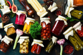 Zdjęcie "Zestaw konserw warzywnych i grzybów w szklanych słoikach. Zestaw marynowanego jedzenia na czarnym kamiennym tle. Widok z góry." może być wykorzystywane do celów osobistych i komercyjnych zgodnie z warunkami zakupionej licencji Royalty-free. Obraz jest dostępny do pobrania w jakości wysokiej rozdzielczości do 5760x3840.