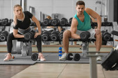 Sportowy trening młodych par z hantlami na tle koloru