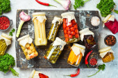 Zdjęcie "Zestaw konserw warzywnych i grzybów w szklanych słoikach. Zestaw marynowanego jedzenia na czarnym kamiennym tle. Widok z góry." może być wykorzystywane do celów osobistych i komercyjnych zgodnie z warunkami zakupionej licencji Royalty-free. Obraz jest dostępny do pobrania w jakości wysokiej rozdzielczości do 5760x3840.