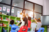 kobieta nauczyciel w klasie nauczania dzieci w wieku przedszkolnym, radosna nauka wraz z mieszane rasy międzynarodowych dzieci