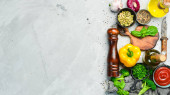 Zdjęcie "Pochodzenie kulinarne. Cebula, czosnek i przyprawy na czarnym kamiennym tle. Widok z góry." może być wykorzystywane do celów osobistych i komercyjnych zgodnie z warunkami zakupionej licencji Royalty-free. Obraz jest dostępny do pobrania w jakości wysokiej rozdzielczości do 5760x3840.