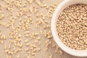 Surowa zielona gryka w drewnianej misce na brązowym drewnianym stole. Widok z góry z miejscem na tekst