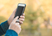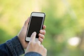 Ręce za pomocą telefonu komórkowego w wiosennej przyrodzie