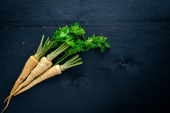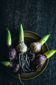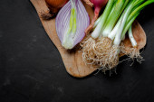 Świeże dojrzałe zielone cebule wiosenne ze świeżo posiekaną zieloną cebulą na czarnym kamiennym tle. Widok z góry.