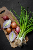 Zdjęcie "Świeże dojrzałe zielone cebule wiosenne ze świeżo posiekaną zieloną cebulą na czarnym kamiennym tle. Widok z góry." może być wykorzystywane do celów osobistych i komercyjnych zgodnie z warunkami zakupionej licencji Royalty-free. Obraz jest dostępny do pobrania w jakości wysokiej rozdzielczości do 5760x3840.