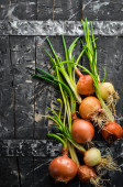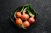 Świeża cebula na czarnym kamiennym tle. Cebula zielona.