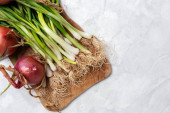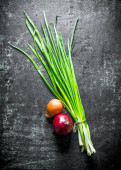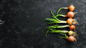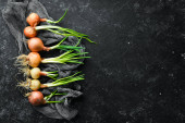 Świeża cebula na czarnym kamiennym tle. Cebula zielona.