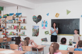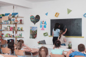 nauczyciel w klasie z grupą międzynarodowych dzieci w przedszkolu uwagę w uczeniu się razem