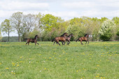 Zdjęcie "Stado młodych ogierów idzie na pastwisko po raz pierwszy w słoneczny wiosenny dzień. Błękitne niebo. Galopujące ujeżdżenie i skakanie ogierów konnych na łące. Konie hodowlane." może być wykorzystywane do celów osobistych i komercyjnych zgodnie z warunkami zakupionej licencji Royalty-free. Obraz jest dostępny do pobrania w jakości wysokiej rozdzielczości do 5760x3840.