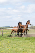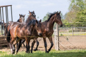 Stado młodych ogierów idzie na pastwisko po raz pierwszy w słoneczny wiosenny dzień. Błękitne niebo. Galopujące ujeżdżenie i skakanie ogierów konnych na łące. Konie hodowlane.