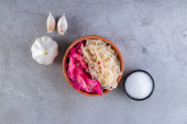 Zdjęcie "Sałatka z szynką, czerwonym i pomarańczowym pieprzem, grzybami, ogórkami, białym sosem, na białej misce i oliwkach. Krojona czerwona cebula. oliwa z oliwek na małej białej misce. Biały obrus ." może być wykorzystywane do celów osobistych i komercyjnych zgodnie z warunkami zakupionej licencji Royalty-free. Obraz jest dostępny do pobrania w jakości wysokiej rozdzielczości do 5760x3840.