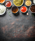 Sos chili Ketchup z pomidorami. Gorący czerwony sos. Na czarnym kamiennym tle.