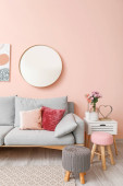 Wnętrze pięknej nowoczesnej sypialni z wiosennymi kwiatami