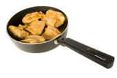Przegrzebki i krewetki gotowane w curry w wok na białym tle