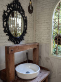 Biały czysty ceramiczny zlewozmywak i kran na zabytkowym drewnianym stole i zabytkowe lustro na białym ceglanym tle ściany w stylu pionowym.