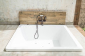 Biały czysty ceramiczny umywalka i kran na zabytkowym drewnianym stole i zabytkowe lustro i drewniana drabina dekoracji na białym ceglanym tle ściany w stylu pionowym.