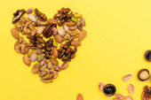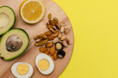 Płaska dieta ketogenna. wokalo, jajka, cytryna, orzechy na drewnianej desce do krojenia na żółtym tle. Koncepcja zdrowej żywności.Kopiuj miejsce na makietę