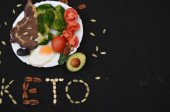 Płaska dieta ketogenna.Napis 'KETO DIET "wykonany jest z orzechów i jajka.Ramka awokado, jajka, cytryna, orzechy na żółtym tle, widok z góry.Pojęcie zdrowej żywności