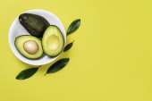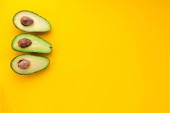 Płaska dieta ketogeniczna.Ramka awokado, jajka i cytryna na żółtym tle, widok z góry.Koncepcja zdrowej żywności.Kopiuj miejsce na makietę
