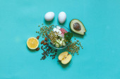 Płaska dieta ketogenna. Jaja, cytryna i orzechy na zielonym i pomarańczowym tle. Pojęcie zdrowej żywności, widok z góry.Kopiuj miejsce na makietę